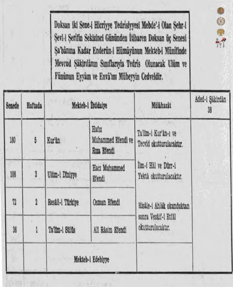 Young people who were taken to Enderun School were called inner boys. They were trained in three ways: a) to teach palace affairs by actually performing palace services, b) to receive an institutional education in the field of Islamic and some positive sciences, c) to receive an education according to their abilities in areas such as physical and art education.43